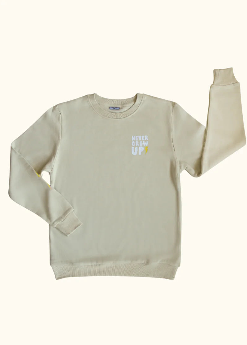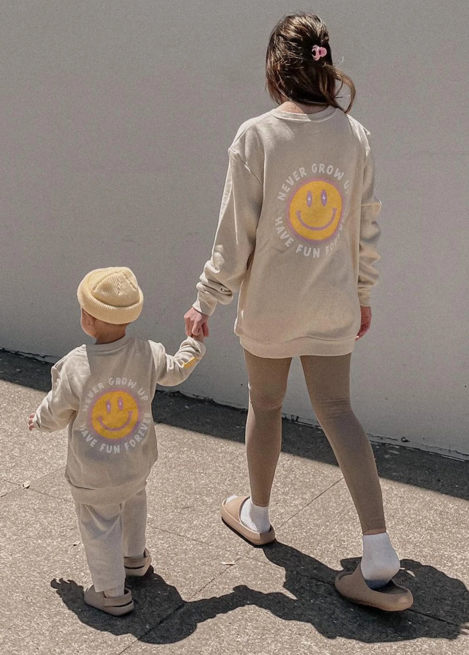 The Never Grow Up Crewneck in Sand, Jean Shorts, Vans, a summer BBQ and a matching mini. What could be better? Sustainably made from the signature Little Trouble blend (perfect parts organic cotton + bamboo), this lightweight crew is made to be worn and loved without fading.