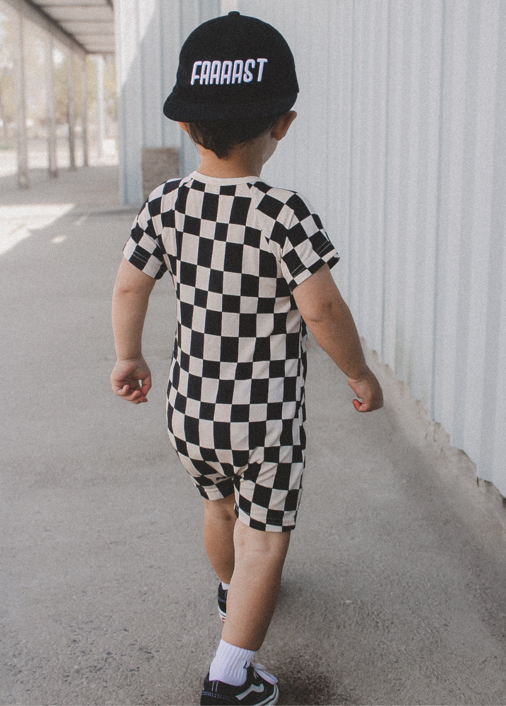 It's cute, it's classic and it's SO COMFY. The Classic Checked Out romper is a bold black-and-cream checkerboard print that’s part race day, part skater deck, and 100% iconic. Designed for little ones who already have main character energy, this drop is a nod to vintage street culture with a modern twist.