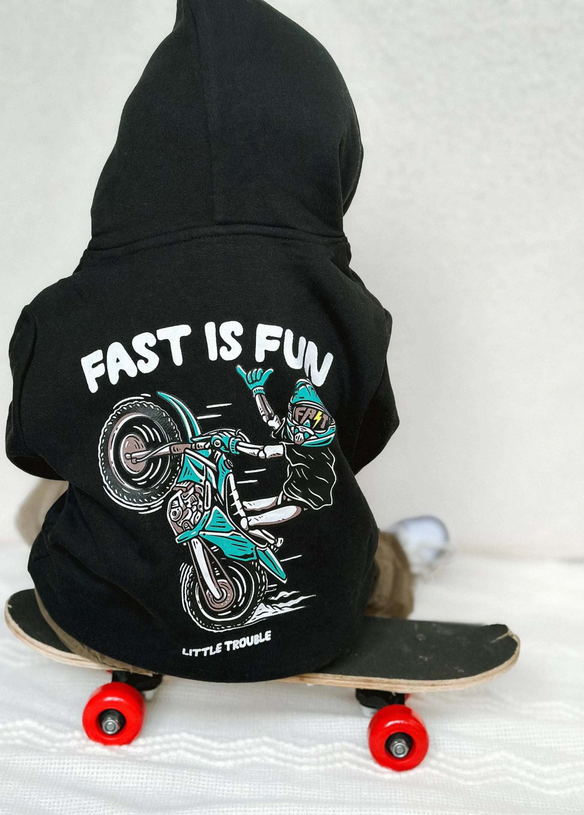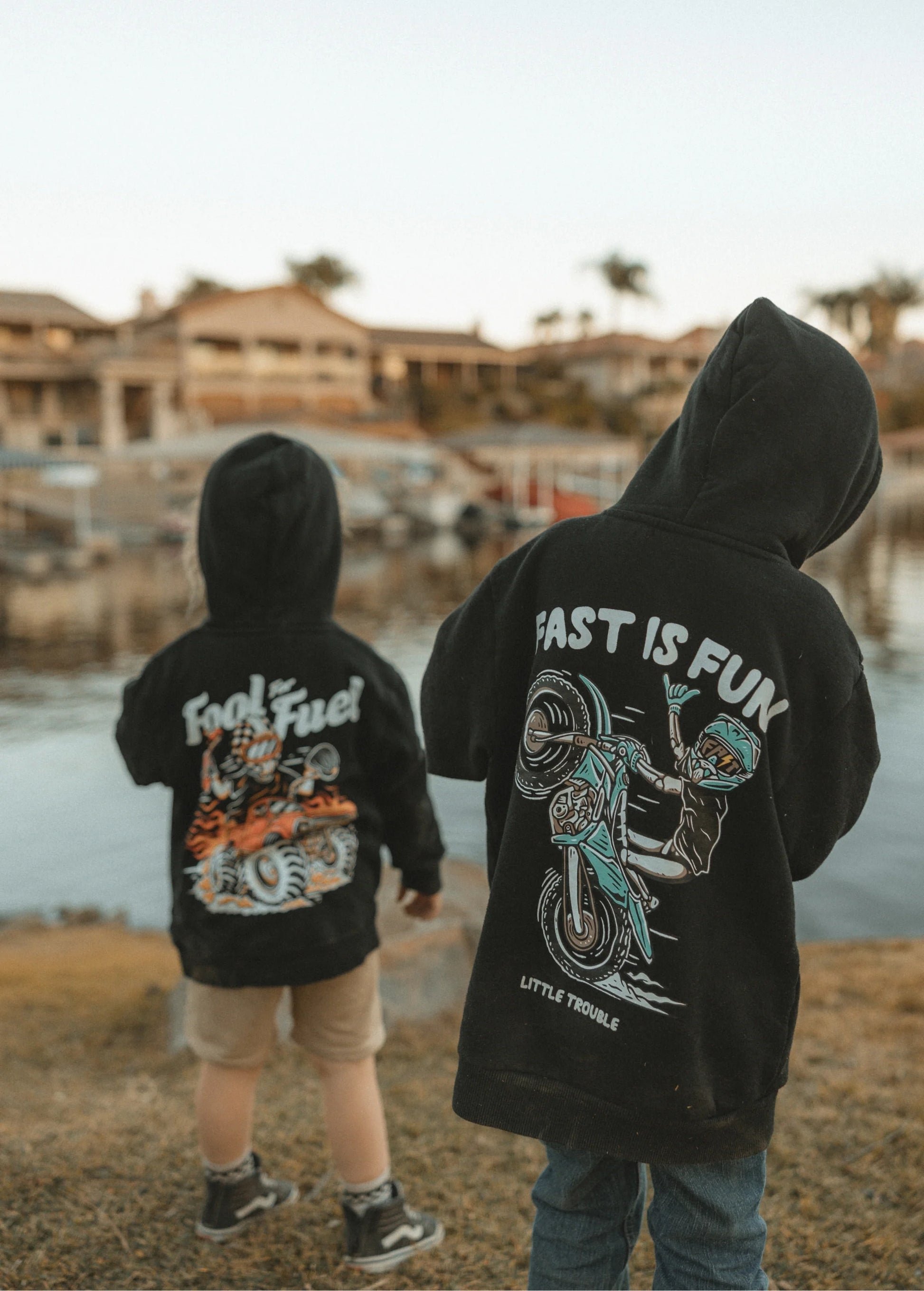 The Fast is Fun Hoodie is made for the little rippers and risk-takers chasing adventure. Inspired by the SoCal, where the sand meets the dirt and all the little trouble makers out there. Sustainably made from the signature Little Trouble blend (perfect parts organic cotton + bamboo), this lightweight hoodie is made to be worn and loved without fading.