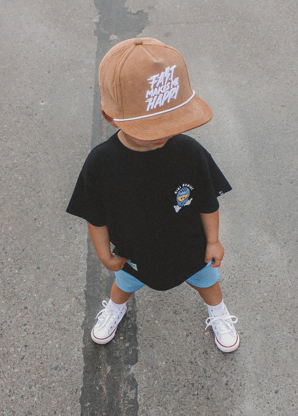 For the kids who don’t walk — they rip. The FAST MAKES ME HAPPY snapback levels up the classic neutral hat in your rotation with a soft brown corduroy crown, bold 3D white embroidery, and contrast cord across the brim for a little something extra.