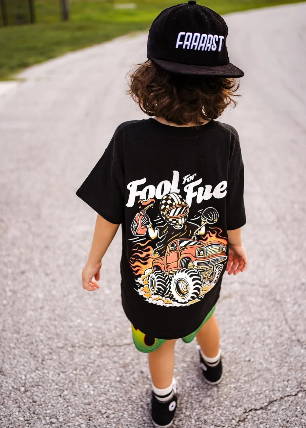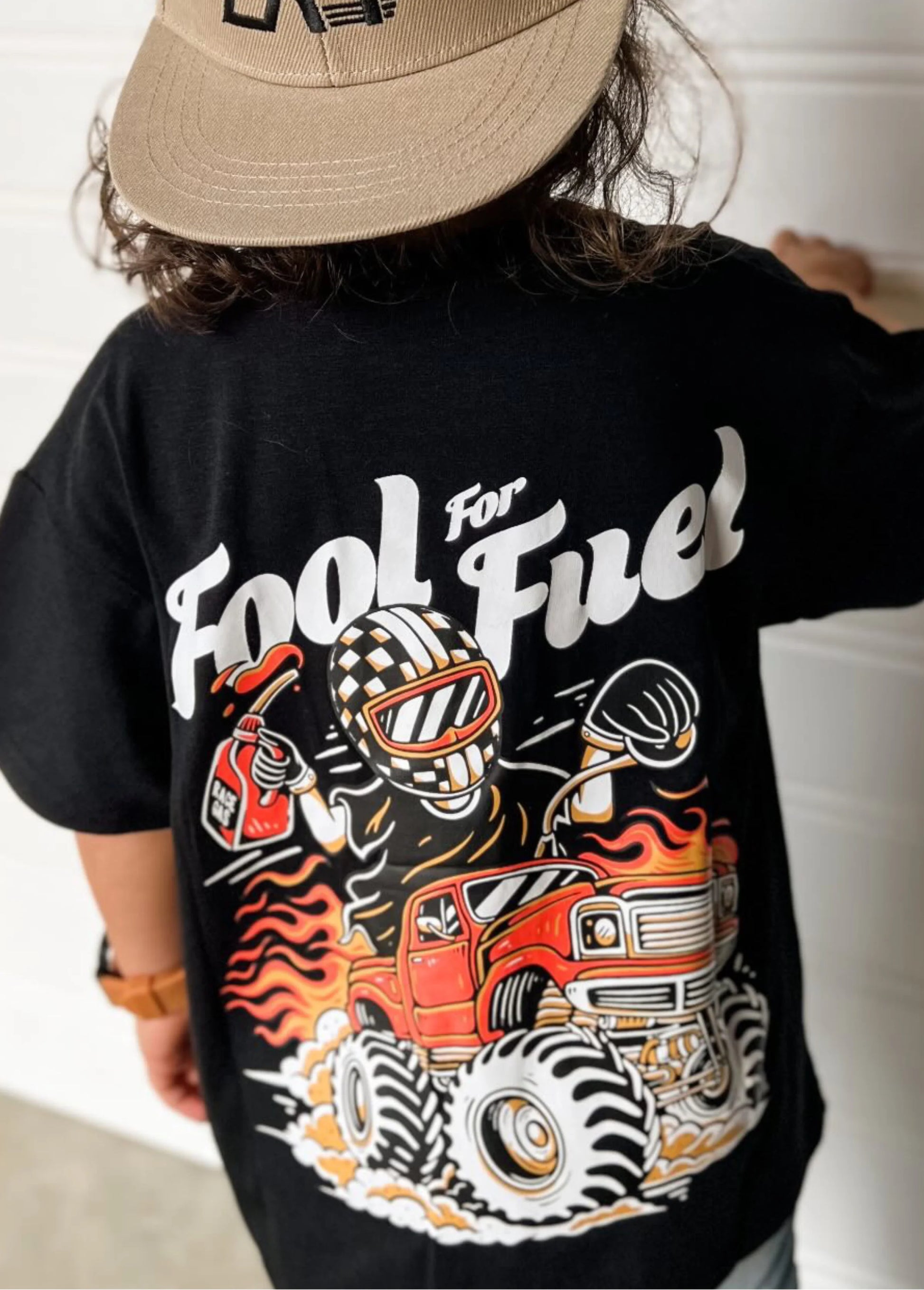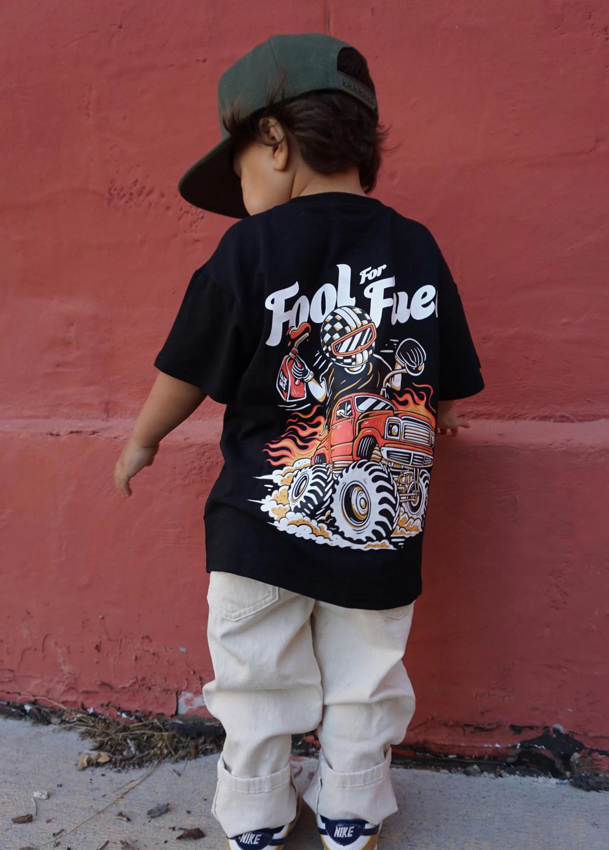 FOOL FOR FUEL. Finally, a truck graphic we actually love. This T-shirt isn't a want... it's a NEED. This custom Little Trouble Monster Truck was uniquely designed down to the Race Gas can.