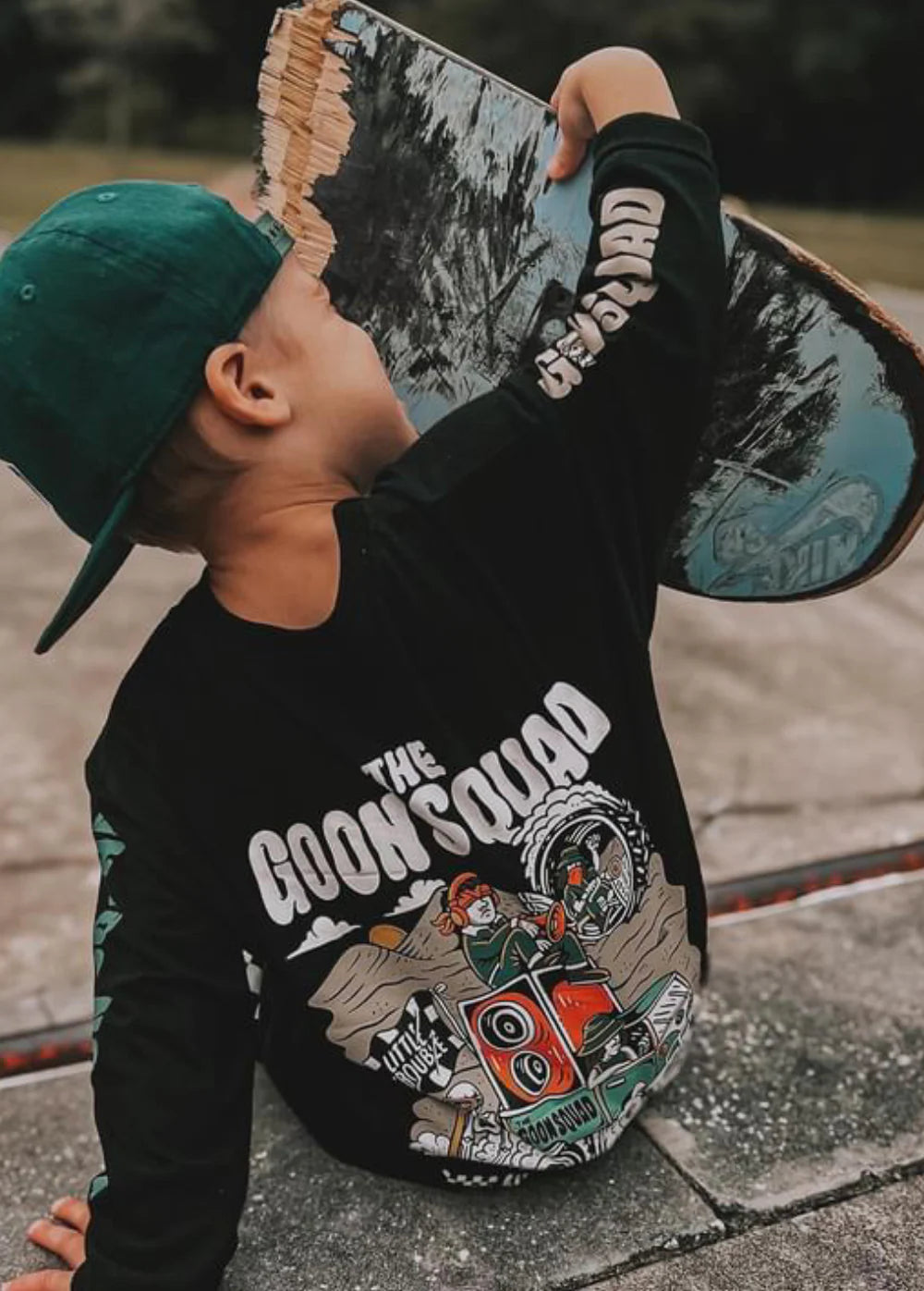 Goon Squad has been living in my head rent-free since I first thought of the design. It just sums up my little goons and their friends better than anything else. Sustainably made from the signature Little Trouble blend (perfect parts organic cotton, bamboo + Spandex), this lightweight oversized long sleeve is meant to be worn and loved many washes later.