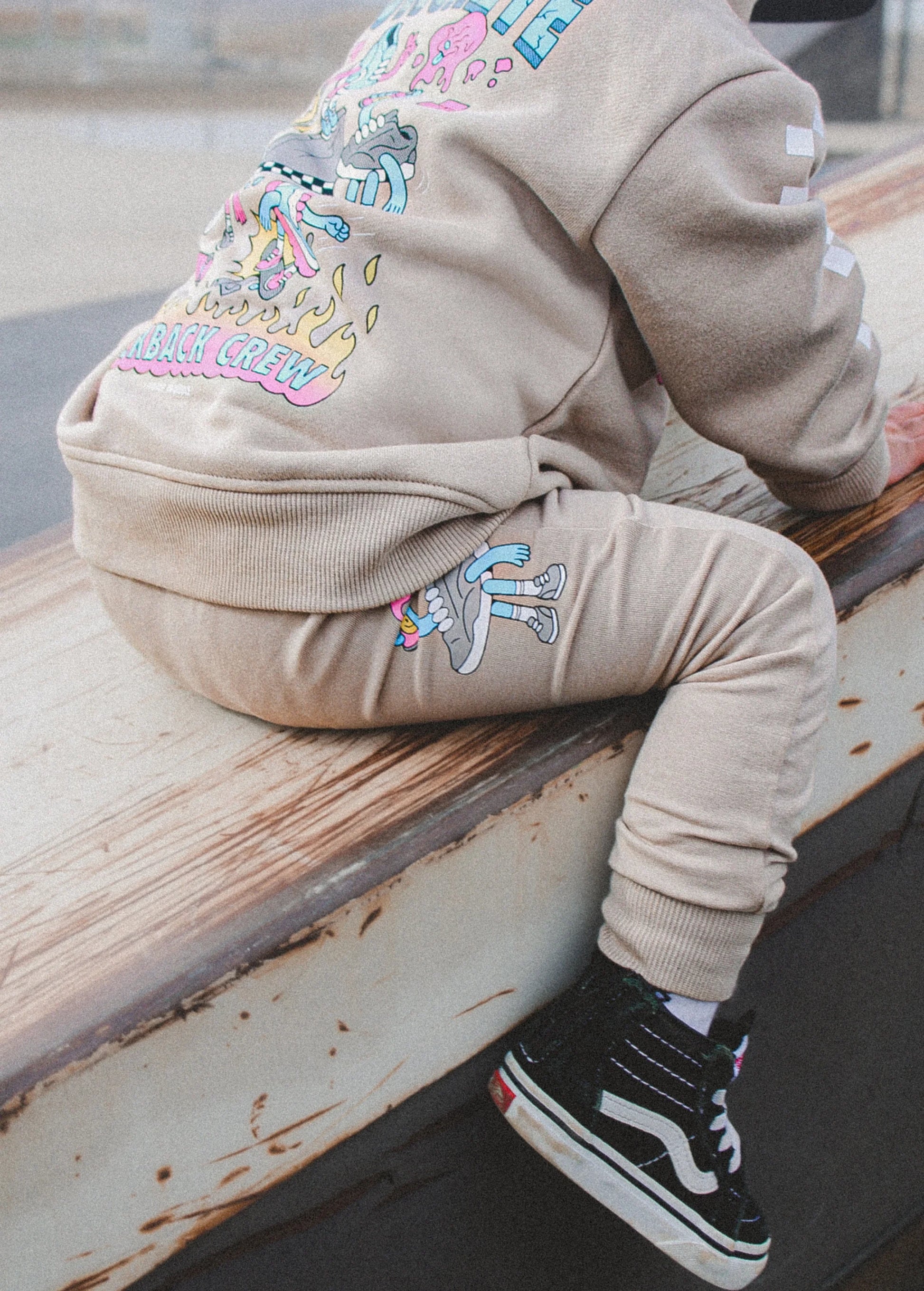 YOU GUYS...WE MADE OUR FIRST SETS! Meet your littles new favorite extra comfy cozy joggers for the first time have matching hoodies and long sleeves! Our Concrete Kickback Crew Joggers come in tan, black and tie dye and quite literally match the hoodie and long sleeve release making the cutest skater capsule of all time. Don't forget to add a hoodie or long sleeve to complete the look!
