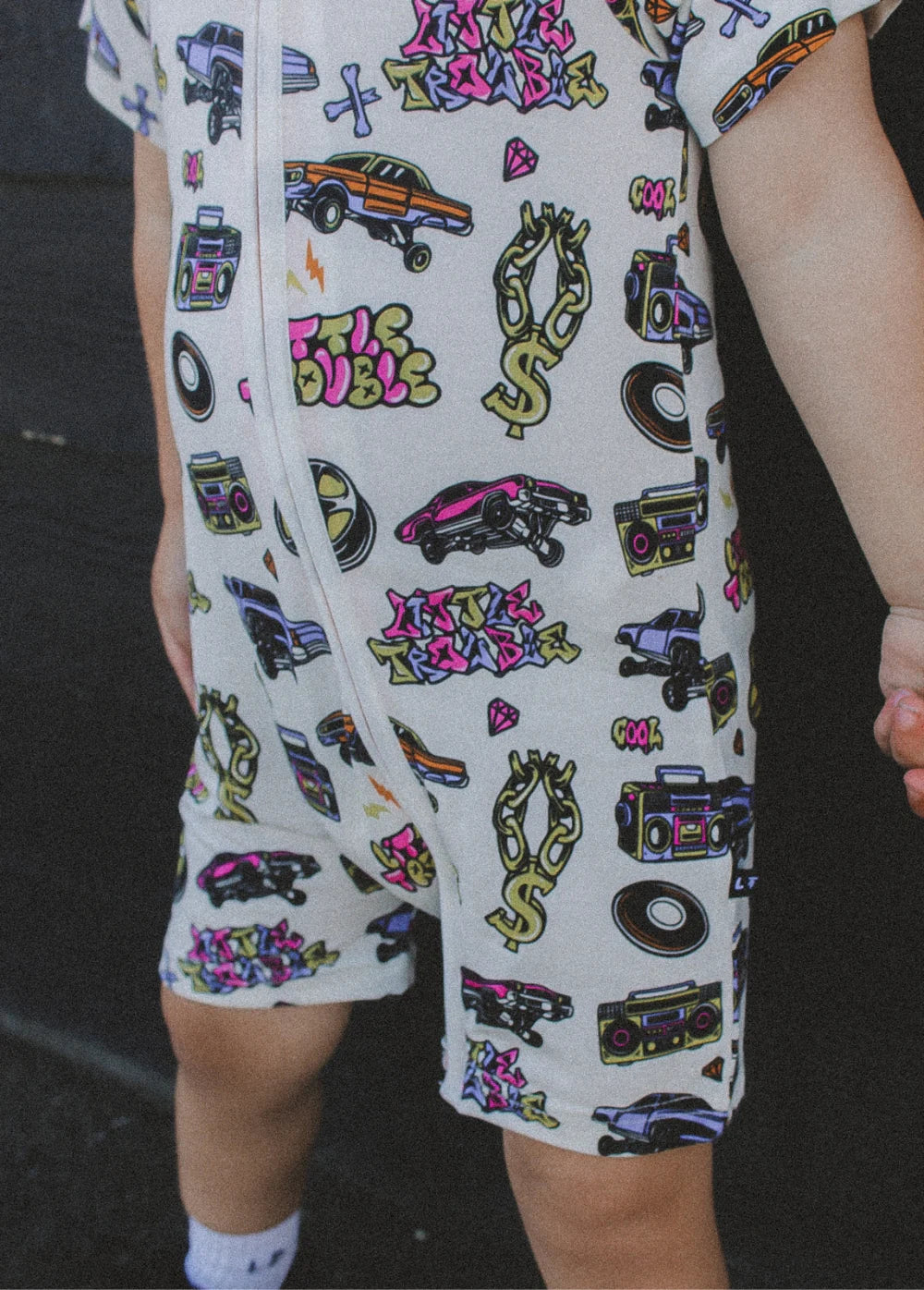 The LT Low Low Shortie pattern is one of my favorites yet. Custom low riders inspired by our neighborhood low lows (shoutout OSIDE OR NO SIDE) LT graffiti tags, that classic boom box we know and love and a fun gold chain for style points. Hand-illustrated (like everything we make) and exclusive to this drop, this isn’t your average babywear — it’s our whole vibe.