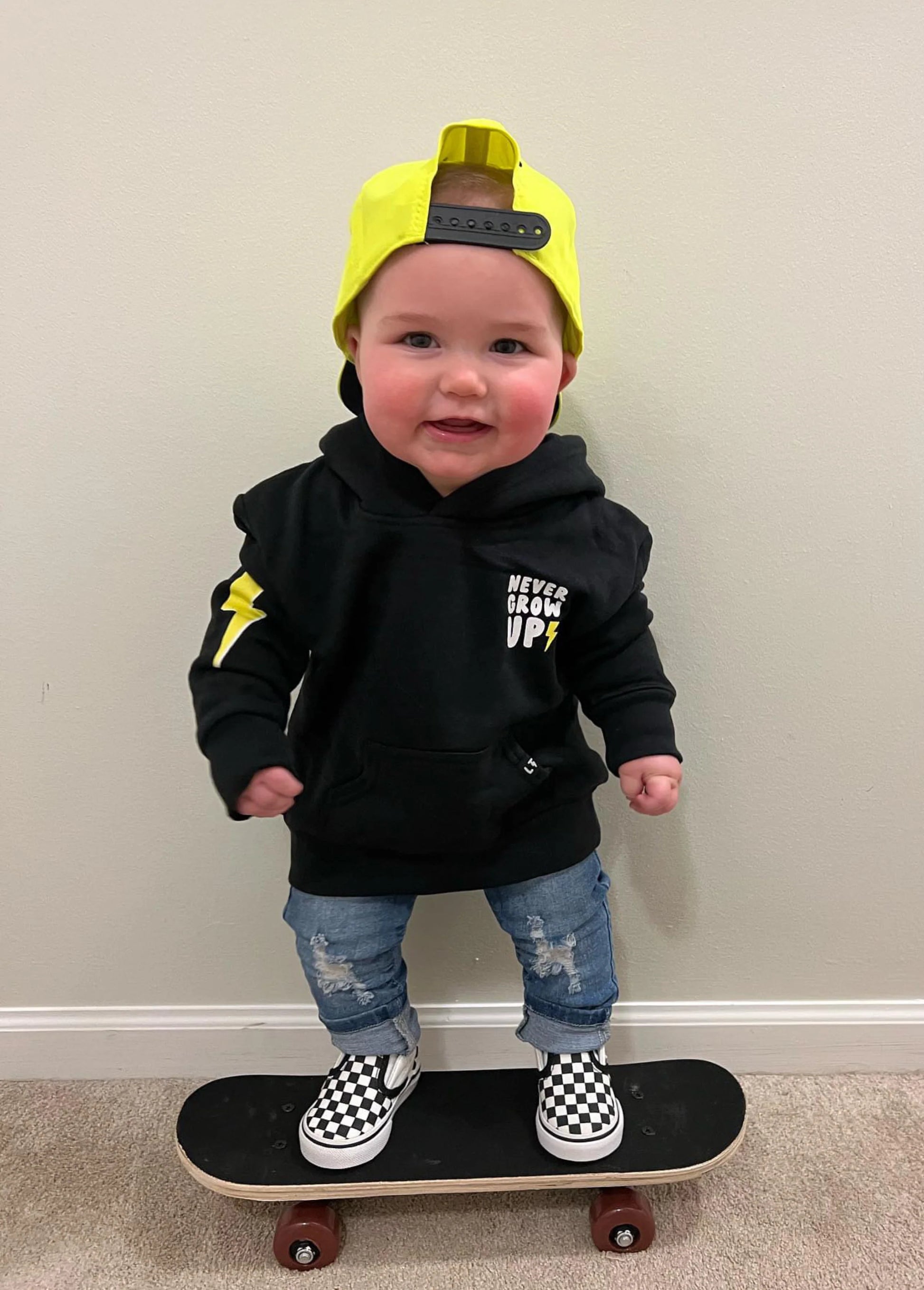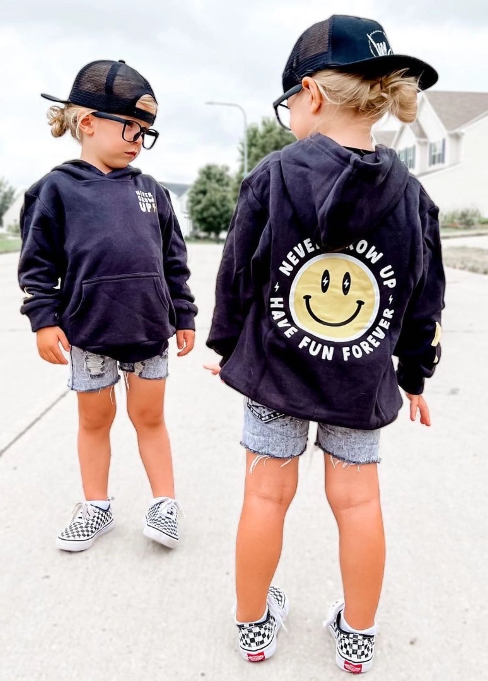 The Never Grow Up Hoodie (with a yellow/white graphic) is the coolest + coziest sweatshirt for the first day of school, the neighborhood block party, or just hanging out with your friends on the playground. Sustainably made from the signature Little Trouble blend (perfect parts organic cotton + bamboo), this lightweight hoodie is made to be worn and loved without fading.
