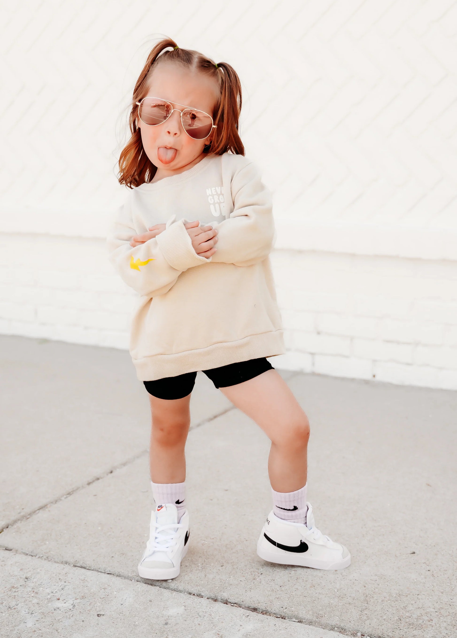 The Never Grow Up Crewneck in sand is the cutest + coziest sweatshirt you'll ever own. Our most loved color combo, pink lemonade on sand, is sustainably made from the signature Little Trouble blend (perfect parts organic cotton + bamboo). This lightweight crewneck is made to be worn and loved without shrinking or fading. Perfect for cold days or warm nights.