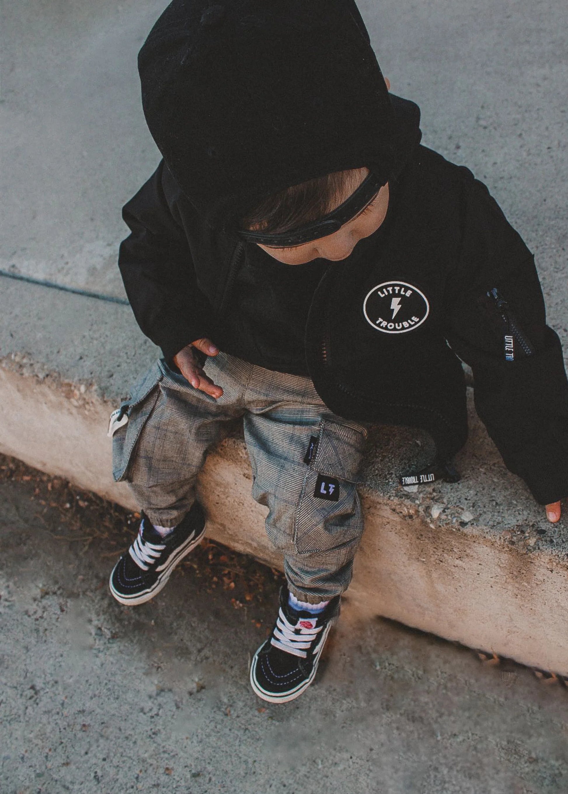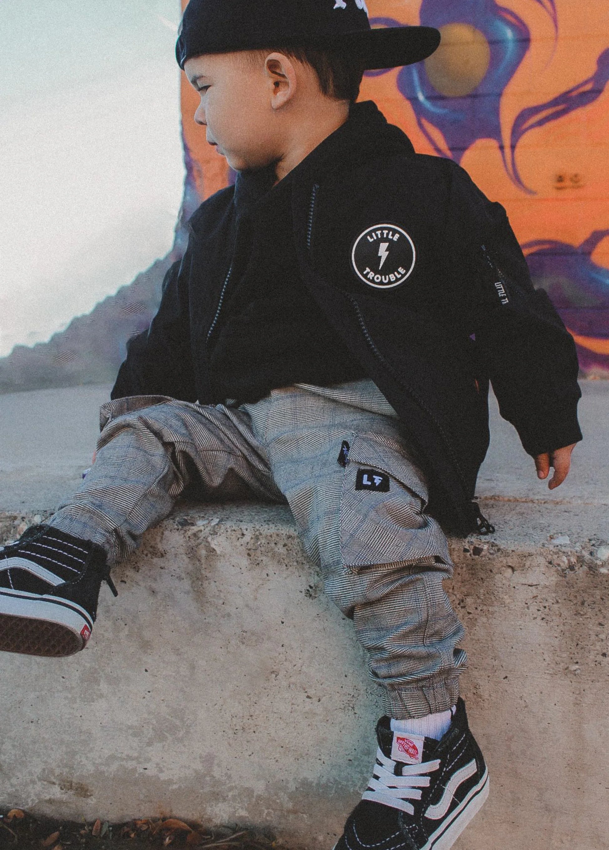 PLAID..what dreams are made of. The cargo pant that beats them all NOW AVAILABLE IN PLAID! These little utility pants have impeccable attention to detail with a branded rubber keychain, pop color clip labels, functional pockets and the comfiest waistband imaginable. Dreaming up the perfect combo? Paired with your favorite sneakers and our Trouble Bomber Jacket.