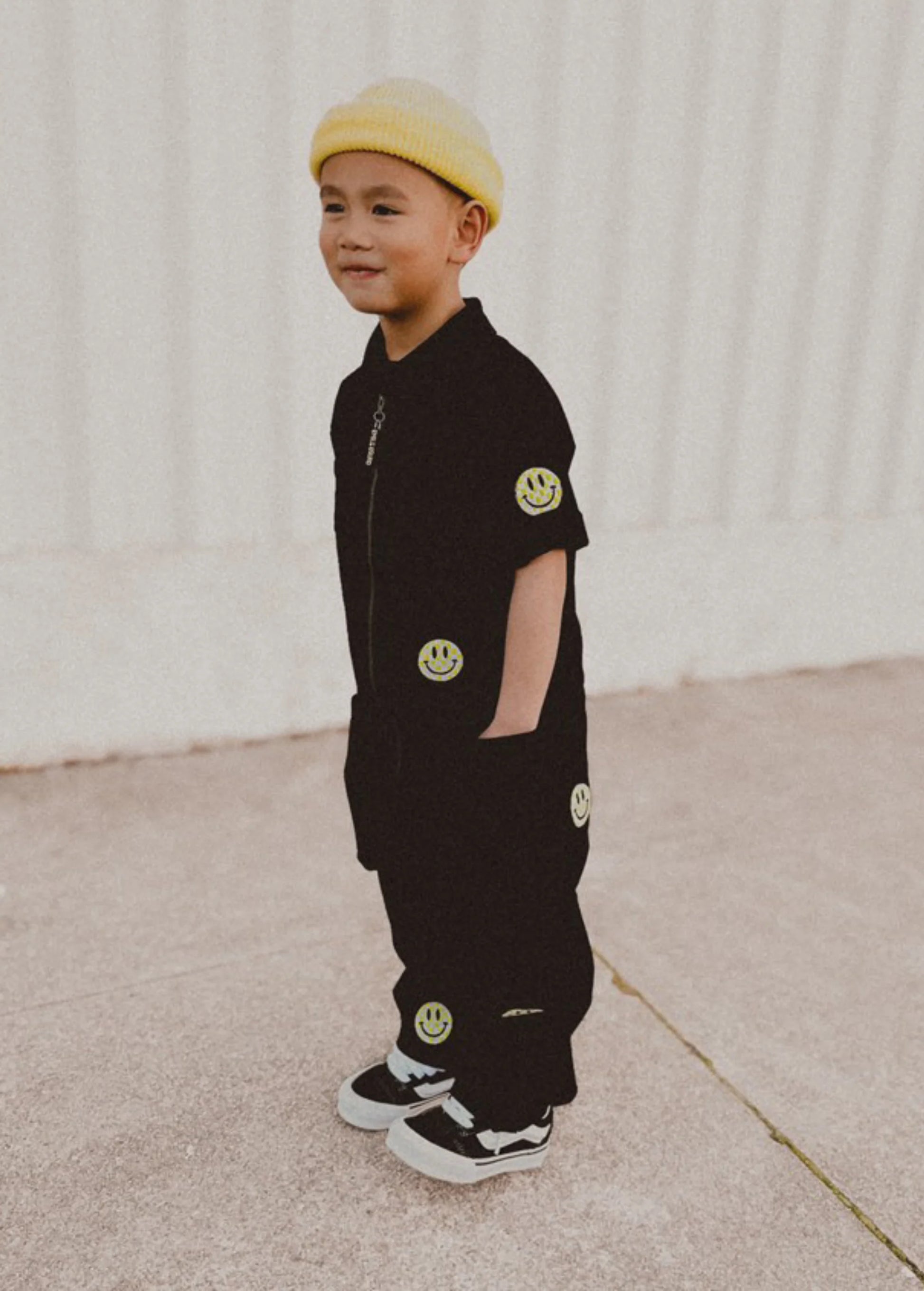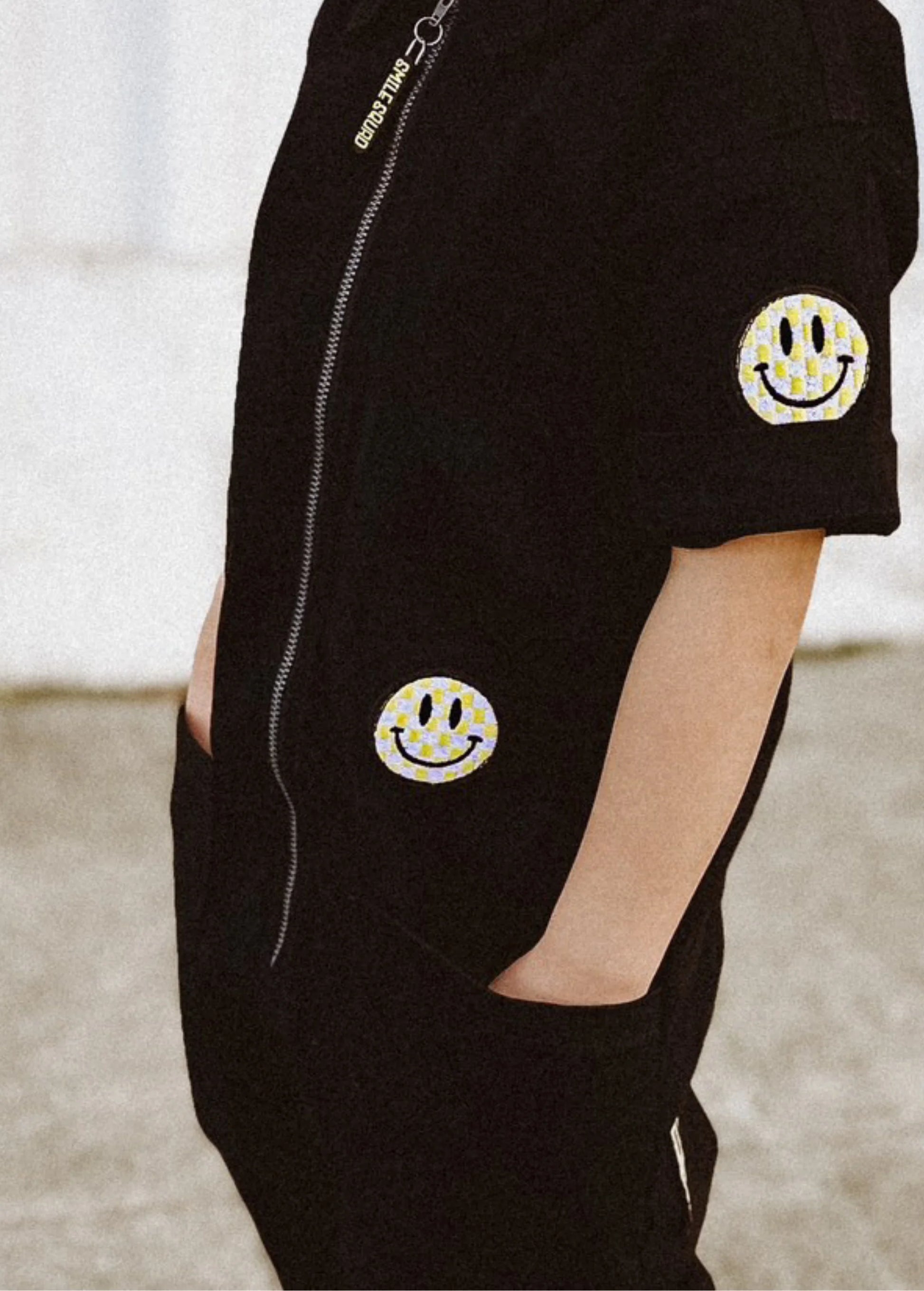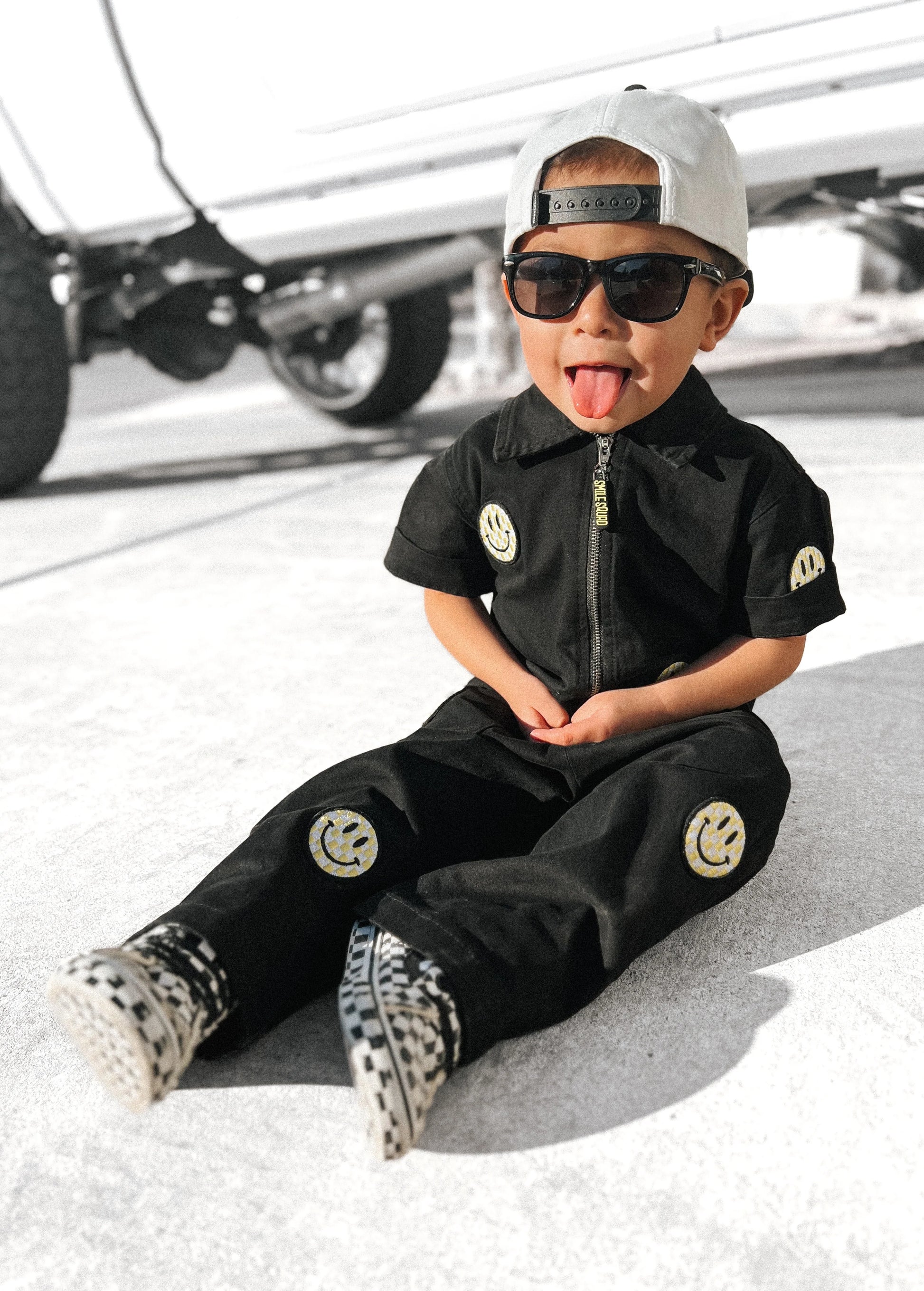 😄 Inspired by my smiley faced baby who looks as cute in this jumpsuit as he does in our overalls...we finally bring you SMILE SQUAD MECHANIC SUIT. The perfect and easiest outfit for your littles guaranteed to make everyone smile ear to ear. Available in Black and Green. Checkers and blue coming soon 👀