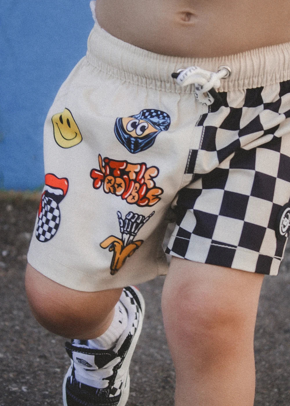 Your favorite sticker slapped helmet look brought to you on summer boardies! If you know anything about us, you know we LOVE stickers here at Little Trouble and we had to find a way to bring that vibe to the beach this summer. All our favorite things, slapped on these perfect pool side boardies.