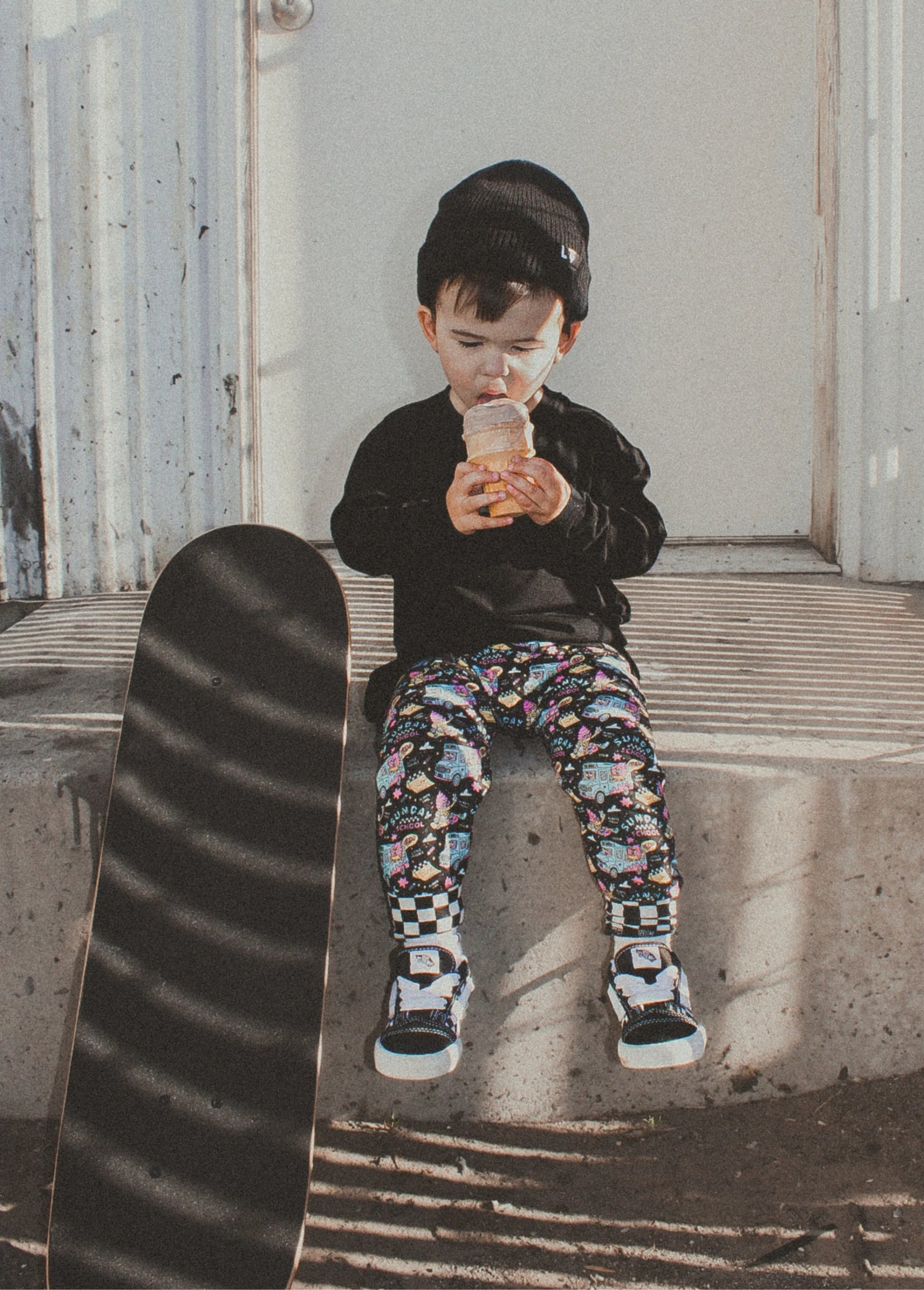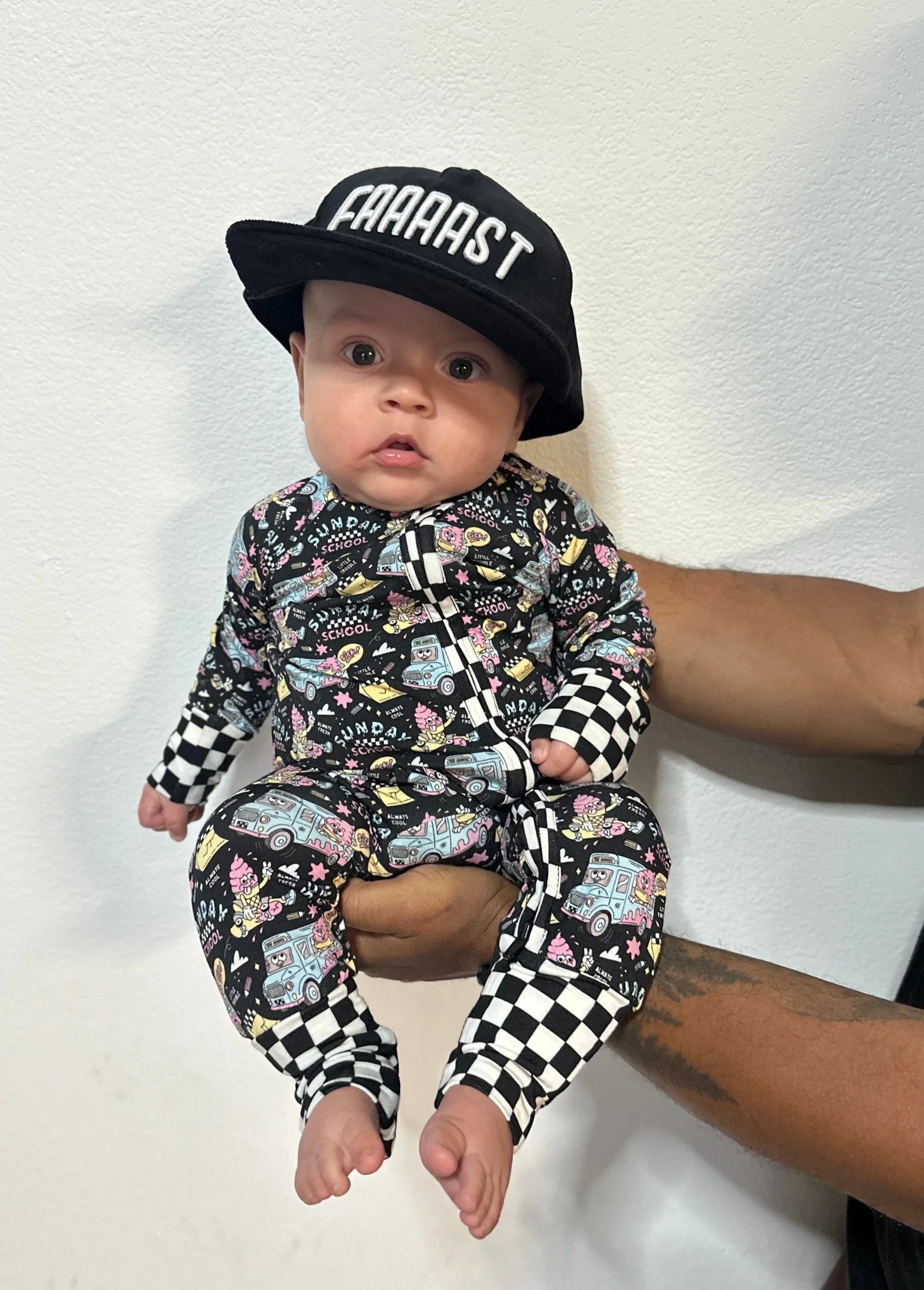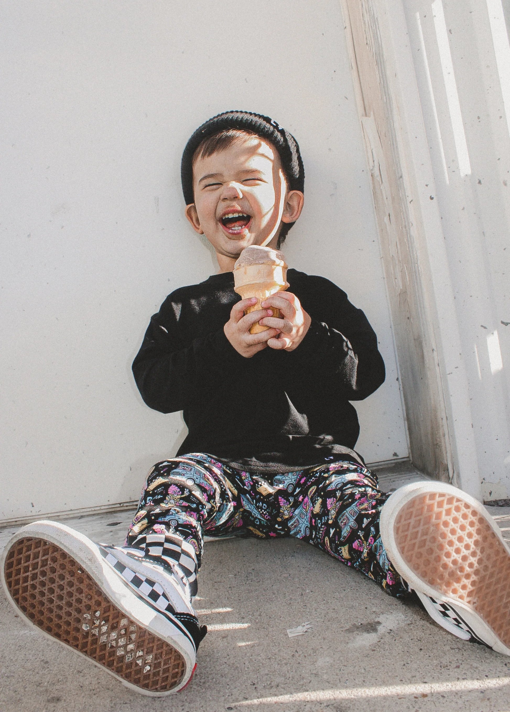 We'll be hear, dreaming of sweet summer treats. Sunday School is inspired by my favorite childhood ice cream shop on Cape Cod where ALL the best memories were made. As a kid, what's better than ice cream!? And of course...I had to make it Little Trouble worthy with some fresh characters and a cone getting some air :) The smaller sizes, 3-6M through 18-24M come in the classic two-way zipper bamboo romper. The bigger sizes, 2T - 6T are two piece sets.