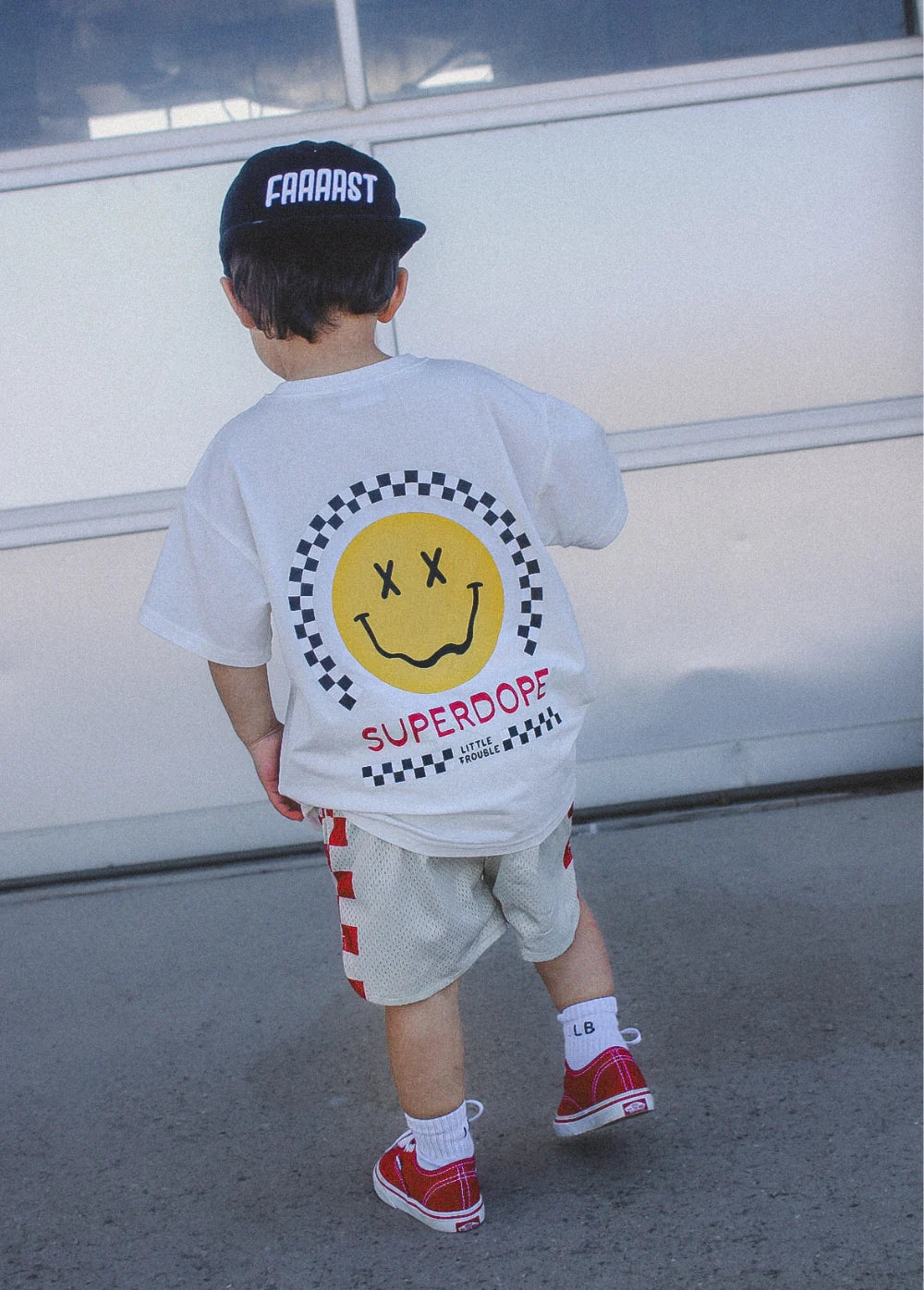 The Superdope T-shirt in white is our FIRST white T and has everything that brings us joy in a design. Colorful smiley faces and black-and-white checkers! Pair this perfect little T with black joggers or cargo pants and a fresh pair of Nikes or Vans for the cutest look of the week.